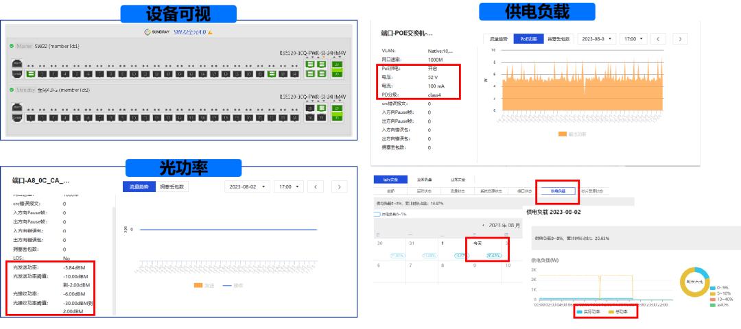在全光4.0方案中,PoF光电一体化交换机除了具备端口可视化功能以外,还能直接看到接口光功率的收发情况,在帮助判断光纤链路质量的同时,保障了通信。此外,信锐全光4.0方案采用的是PoE技术,可以直接在交换机侧看到包括电压、电流、供电负载统计等在内的供电情况。信锐全光4.0还支持通过NMC平台对设备进行远程上下电操作并以此控制AP。