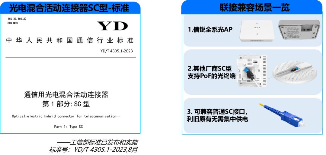 光电混合活动连接器SC型,采用《中华人民共和国通信行业标准YD/T 4305.1-2023》,该行业标准为工信部发布并实施的标准,符合行业标准,未来易演进。