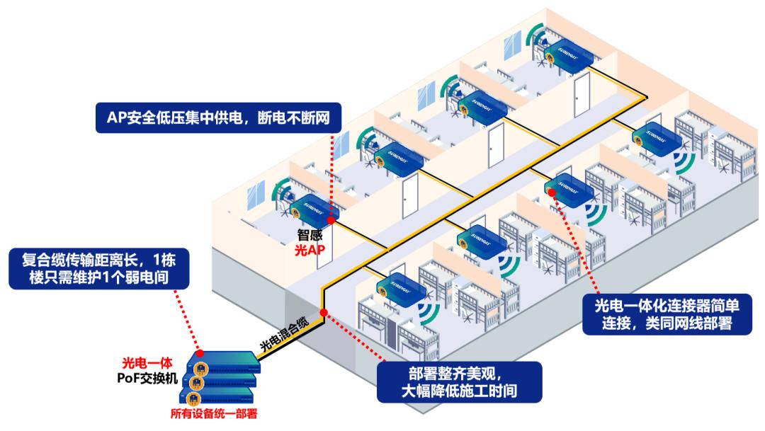 宿舍楼交换机统一部署,中间无源,混合缆传输距离长,1栋楼只需维护1个弱电间。信锐智感光AP采用光电混合缆安全低压集中供电,可以做到晚上就寝断室内电源的情况下不断网。宿舍房间多,AP集中,采用光电一体化连接器简单连接,类同网线部署,部署整齐美观,大幅降低施工时间。